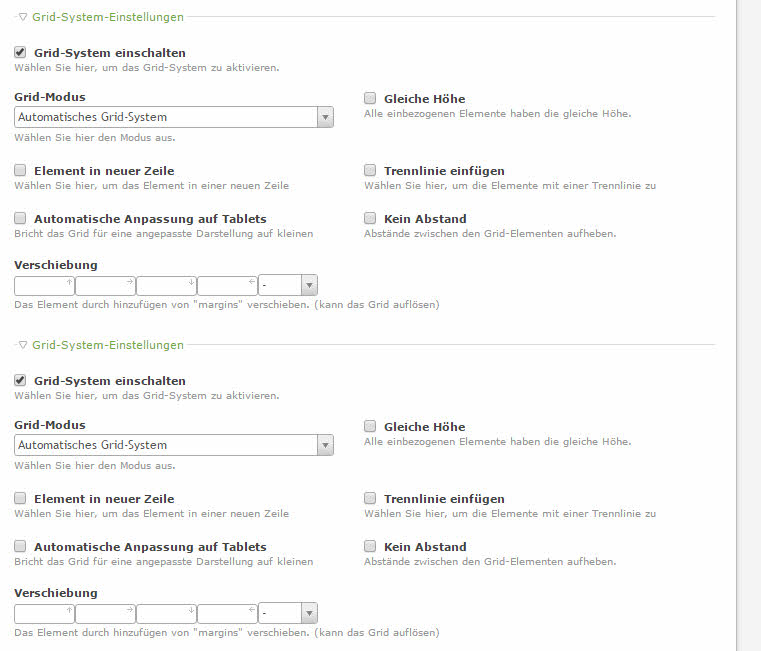 ich habe Contao 3.5.6 und Autogrid 1.3.3., vor ein paar Wochen hat alles ohne Probleme funktioniert. Jetzt ist mir aufgefallen, wenn ich ein Inhaltselement erstelle, habe ich diese doppelten Einstellungen: