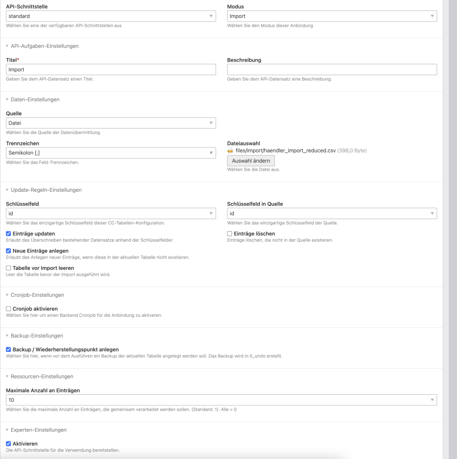 Über das Frontend Modul wird aktuell leider nichts importiert. Wenn in der API Anbindung "Tabelle vor Import leeren" aktiv ist, wird die Tabelle zwar geleert aber nichts importiert. Die zu importierende Datei ist dieselbe, die beim Standard Import ohne Stapelverarbeitung korrekt verarbeitet wird.