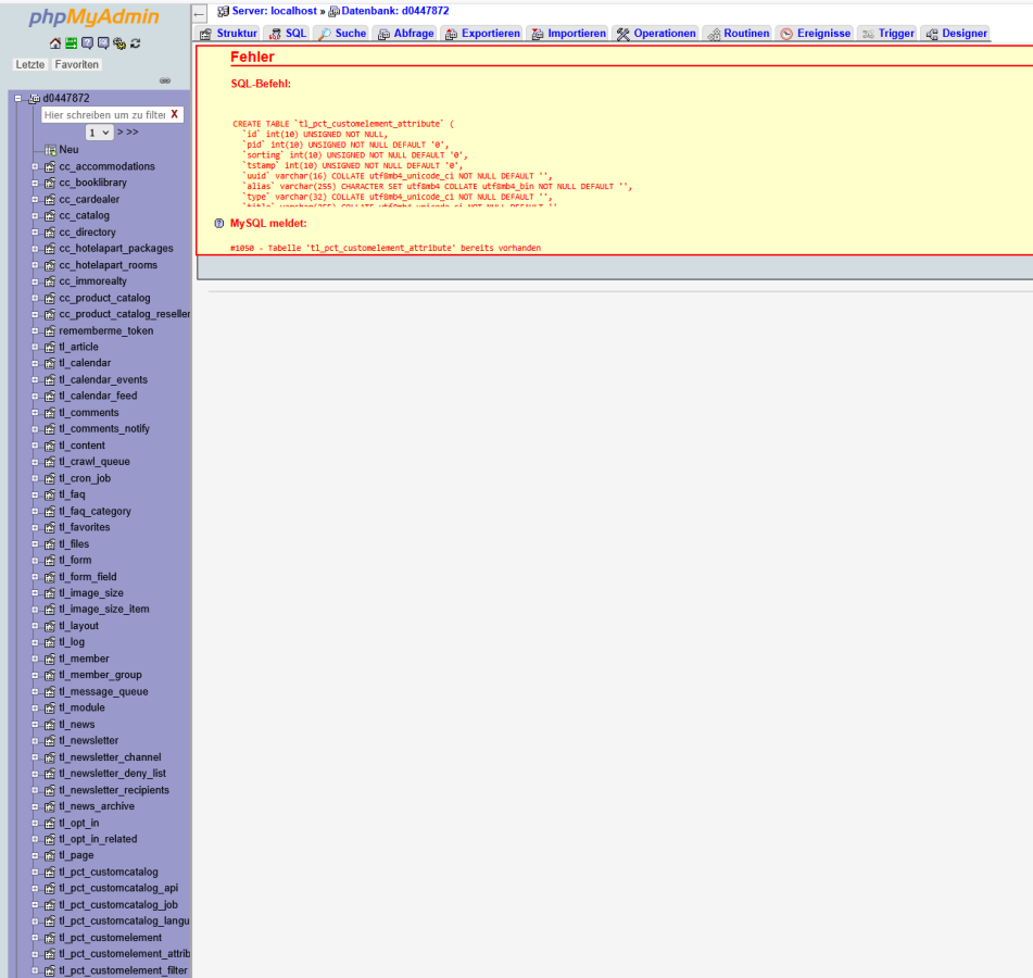 Da ja im Downloadpaket aus dem Kundenbereich keine *.cto-Datei dabei ist, muss die mitgelieferte *.sql Datei in die vorbereitete DB importiert werden. D.h. die Standard Contao- und EX-Tabellen wurden während der Installation schon angelegt.