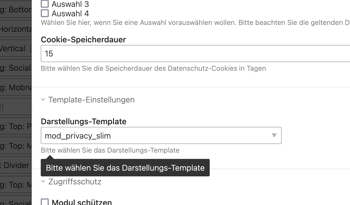 Wenn ich beim Privacy Manager das Template mod_privacy_slim auswähle, erscheint neu diese Meldung, obwohl das Template eingebunden ist: