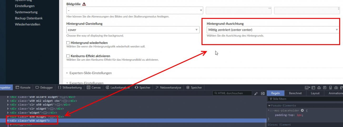 ich habe hier eine Installation, in der die class w50 wohl nicht mitgegeben wird - somit legt sich die Option 'Hintergrund-Ausrichtung' über die Option 'Hintergrund-Darstellung'. Die 'Hintergrund-Darstellung' ist damit nicht mehr anklickbar » class w50 eingetragen und schon klappt's