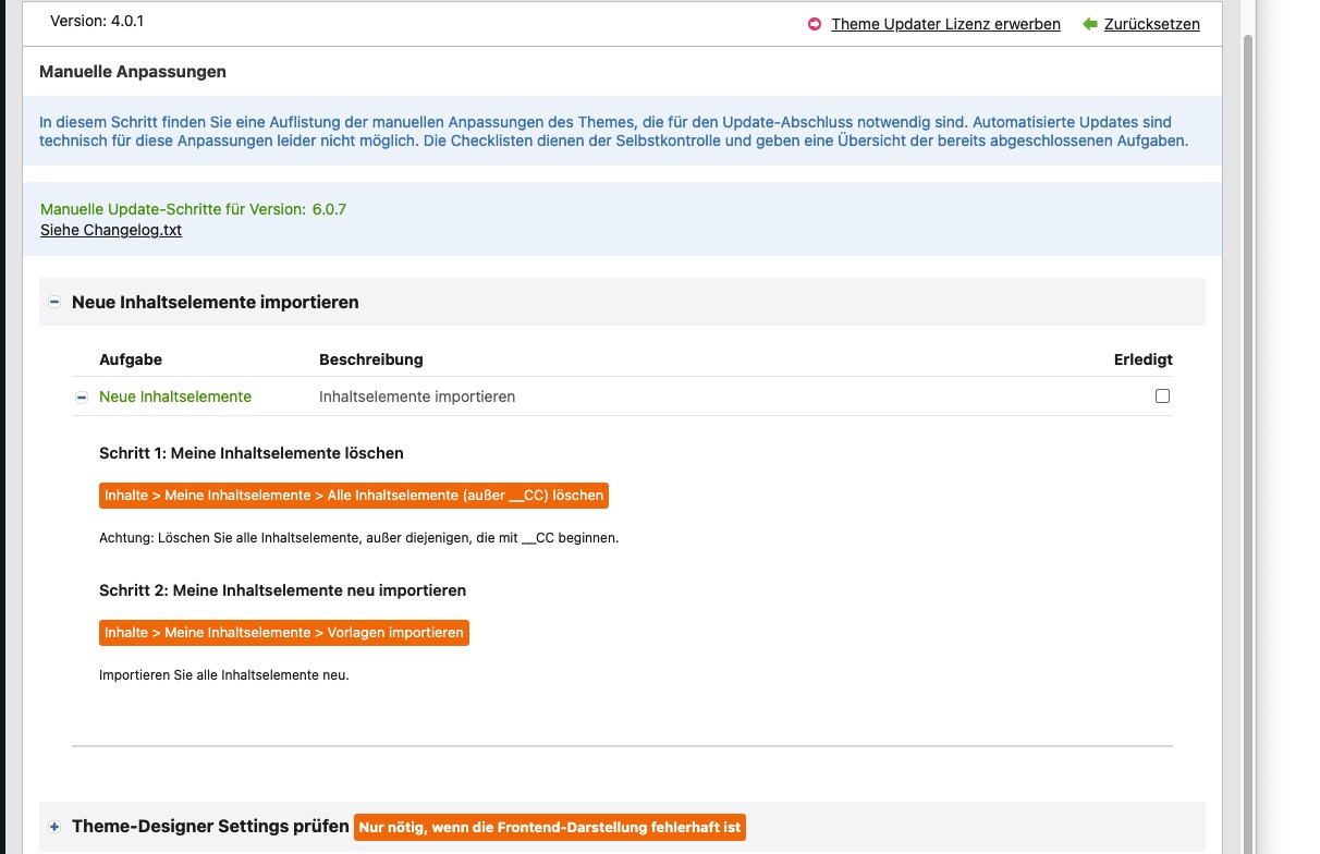 Ausgehend von einer 4.2.6 wird der Theme-Updater im Bereich Manuelle Anpassungen den Reimport der CEs empfehlen. Wurde dies durchgeführt?