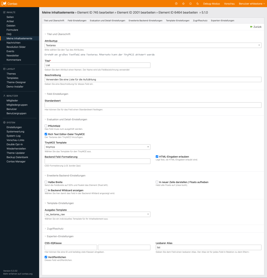 Nach einem Update auf 5.3.32 mit dem Theme-Updater habe ich einen Darstellungsfehler bei der Vorteilsbox. Es sind keine Listenelemente im Backend sichtbar - siehe Anhang: Vergleich von 4.13 und 5.32. Im Frontend werden sie ausgegeben.