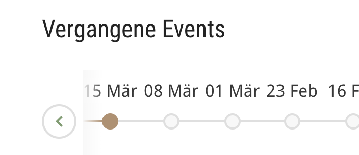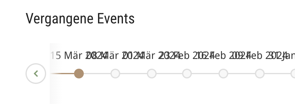 Die Timeline Navigation des Moduls Event Timeline wird bei uns nicht korrekt dargestellt. Die Datumsangaben liegen im Theme weiter auseinander, hier sind sie dicht aneinander. Ich habe keine Möglichkeiten für eine Konfiguration gefunden. Außerdem wollen wir das Jahr ergänzen, aber dann überlagern die Felder komplett.