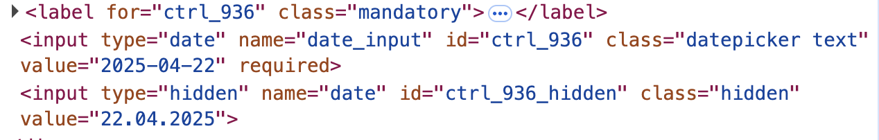 Nach dem Ändern in ein anderes Datum ist nach wie vor eine Trennung mit "." sichtbar aber das Hidden Field ändert sich in "-" Trennung: