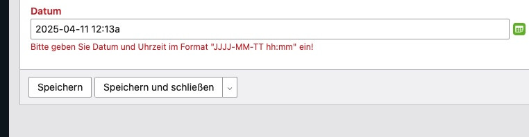 Der Picker setzt die Zeitwerte korrekt ein. Bei Eingabe invalider Zeichen oder falscher Datumsformate, springt die Prüfung an.